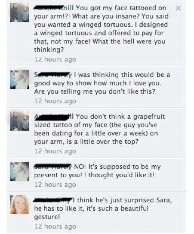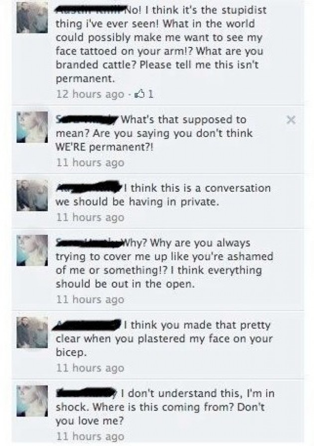If you’re going to get a tattoo of your boyfriend’s face on your arm,make sure you know he’s just as committed to you as you are to him before you head down to the parlor. Also, you might want to tell him in private before sharing it with the world. Otherwise, something like this might happen…